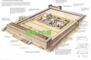 この画像はイエスさま時代の神殿の様子になります。真ん中には聖所と至聖所があります。それを囲むように広場があり、そこに異邦人の庭というところがありました。黄色い印をつけたところには壁があり、これが「隔ての壁」になります。